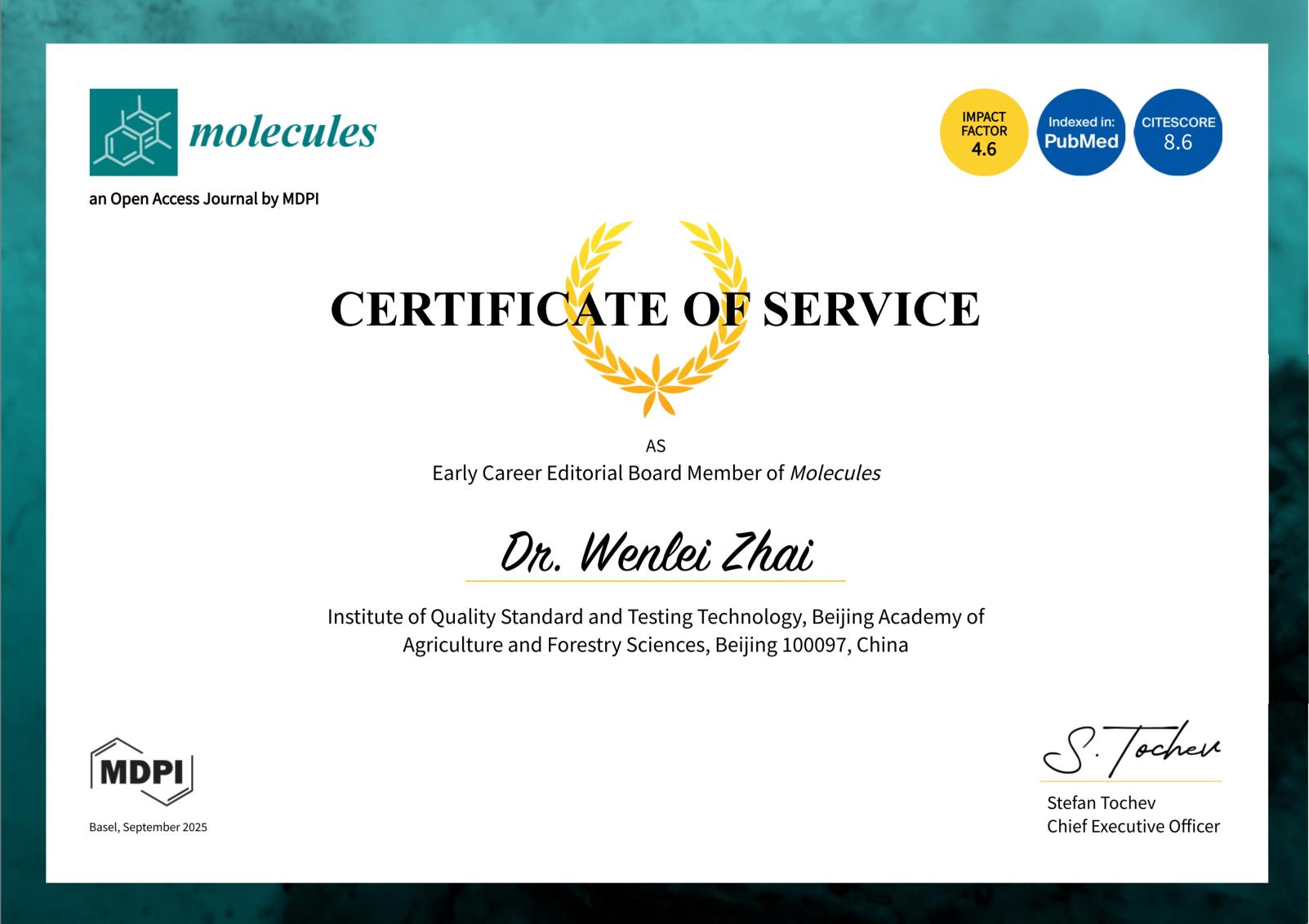 近期,国际SCI学术期刊《Molecules》(影响因子4.6)公布了第一届青年编委会(Early Career Editorial Board)名单,我所品质评价与控制研究室的翟文磊副研究员入选。《Molecules》是MDPI旗下化学领域的知名学术期刊,其内容涵盖有机化学、天然产物化学、化学生物学、分析化学等多个方向,2025年公布的影响因子为4.6,目前为化学、生物化学和分子生物学领域Q2区期刊(JCR分区)。此次《Molecules》首届青年编委会招募工作面向全球化学领域各个方向的青年科研人员,最终有80人入选,其中来自国内高校、科研院所的青年学者共31人。