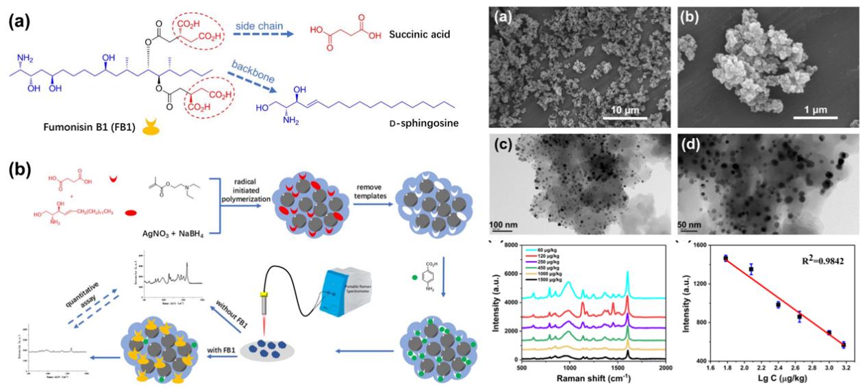 伏马毒素是串珠镰刀菌、轮状镰刀菌等在侵染农作物过程中产生的一类次级代谢小分子化合物,在谷物特别是玉米中检出率较高。其中,伏马毒素B1(FB1)是最主要且毒性最强的组分。现有研究表明,FB1具有神经毒性、免疫毒性、生殖毒性和致癌性,被国际癌症研究机构评定为2B级致癌物。因此,研制FB1的快检技术研究,对于明确其在谷物中污染现状并有效预防FB1带来的健康风险具有重要意义。该研究首先针对FB1分子的化学结构特点,设计并验证了以丁二酸和d-鞘氨醇作为FB1的替代模板制备分子印迹聚合物(MIP)的可行性。在此基础上,通过在MIP材料的孔隙内原位生长银纳米颗粒(AgNPs),获得具有表面增强拉曼光谱(SERS)活性且对FB1有特异性吸附作用的AgNPs@MIP复合纳米材料。为提高对FB1的检测灵敏度,该研究创新性地引入了4-氨基苯甲酸(PABA)作为SERS探针,利用AgNPs@MIP对FB1的特异性吸附作用,取代预吸附在MIP活性位点上的PABA,通过探针分子SERS信号的变化,实现对FB1的定性和定量检测。该方法检出限可达15 ng mL-1,比欧盟规定的限量标准低两个数量级。最后,通过对玉米、小麦、大麦样品的检测,并与基于液质联用的标准方法进行对比,验证了该方法用于谷物实际样品中FB1定量检测的可行性。该研究为粮食和饲料中FB1污染的快速筛查提供了新的技术手段。特别是以两种低成本化合物替代昂贵的FB1标准品,成功制备了可特异性吸附FB1的MIP材料,相关成果已获授权国家发明专利(ZL 202310217273.0)。